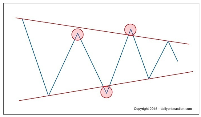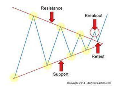 顾名思义,楔形技术形态下,价格向一个狭窄区域发展,也称之为三角形态。与头肩顶形态不同,楔形通常被认为是持续形态。这意味着一旦被突破,价格倾向于向之前趋势的方向发展。