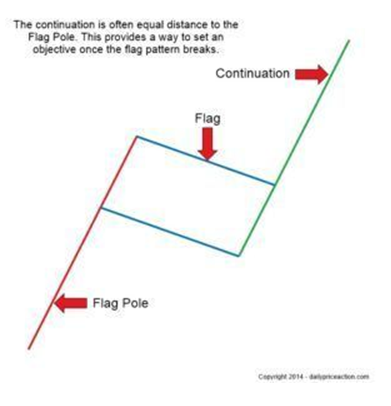 与头肩形态类似,旗形通常在持续上行和下行后形成,代表巩固阶段,是市场的争夺点,多空双方在此争夺控制权。