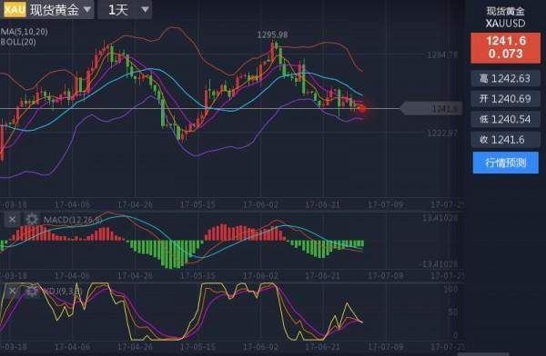 要有天生我材必有用,舍我其谁的自信。很多人不缺迈向成功的资本,但缺乏自信,由于自卑,丧失了本该属于你的机会。 上周黄金行情回顾: 黄金本周整体呈现震荡走低的态势,,最高1258.7一线,最低触及1234一线,周一受乌龙指影响,大幅下挫,打破短期的多头走势,周二触底1240一线受支撑反弹,日线收阳线,周三上探1254一线回落收流星线,周四再次受下降趋势线压制回落收下影线长的小阴线,周五延续周四空头走势继续走低。 从金价日线上可以看出在6月份达到近期的最高点1295之后开始逆转涨势下行,上周黄金走势始终受到布林带中轨的压制,受压于1260美元,日线布林带上中轨开口向下趋势明显,而布林带下轨均线上扬受到压制。而上周五黄金走势再次试探下方1240点位并虚破至1239,可以说多头局势目前来看并不明朗,预示下周金价方向依旧偏空为主。