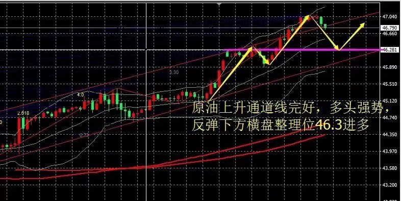 原油技术面分析: 自从原油突破44.0一线,原油方向就开始慢慢转变了,近期一直是以低多为主,方向没问题,就有利润可得。昨日原油行情一路上扬,最高触及47.07,突破47关口,多头非常强势。做投资就是这样,撑死胆大的饿死胆小的,没有魄力就不要来做这高风险高收益的投资,风险是可以控制的。从1小时图来看,低点一直在抬升,高点不断创新高的多头趋势不变,自42一线受支撑以来,原油一路阳线上攻,阴线不断减少,阳线不断增加,多头力量加强,空头力量减弱。综合来看,操作上建.议维持低多的思路不变,下方关注46.50一线支撑,操作上可围绕此位置进行布局多单。