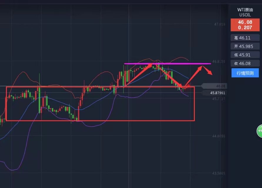 近期的原油多空反复,还处于整理蓄势当中。昨日亚盘走高,但延续不强。欧盘回踩确认支撑,美盘刷新日内低点,日图收盘中阴,缓节奏震荡,大周期看涨,小周期量能不足。需伴随一定回踩蓄势后才能再去冲高,上方强阻力47.3一线,四小时图连阴下探支撑,短周期上涨放缓,做多点位需下移,介于日图收阴,短周期有下行确认支撑的需求,日内保持高空低多思路,操作上46.7做空,止损47.3目标45.8,下方触及45.5-45.6做多,止损45.0目标46.3-46.5。  原油操作建议 1、建议上方46.7附近做空,止损47.3,目标看45.8附近;