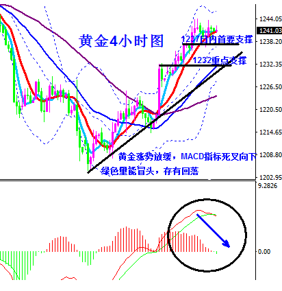 技术面上分析来看,黄金日线图上收取一根下影线较长的小阴线,涨势有所放缓,MA5均线强势上行于1237.3附近形成首要支撑,布林中轨于1232附近继续形成支撑,MA10均线于1226.5形成第三道支撑,上方首要压力则是MA55均线1246位置,MACD指标于0轴下方延续金叉向上运行,红色量能依然是成增加态势,指标中性;4小时图上来看,布林带指标依然向上运行,K线运行于MA5/MA10均线粘合处,布林中轨于1237形成关键支撑,此位置一旦失守,则下看MA30均线1232处,布林上轨运行于1246一线,MACD指标于0轴上方交死叉向下运行,绿色量能冒头增加,指标中性;综合分析来看,黄金日线依然维持反弹态势,但短线出现背离,随时面临回落的风险,而昨日也确实出现了回落,但因缺乏利空消息助力,金价还是有所反弹,但反弹力度明显放缓,且日线收阴结束三连阳涨势,所以日内操作思路上建议高空思路对待!
