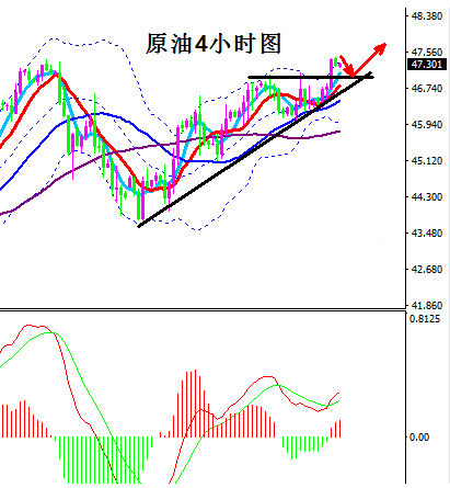 技术面上分析来看,原油日线图上收取一根大阳线,站稳47关键压制上方,布林上轨向上运行于48关口附近,此位置也是周线布林中轨压制位,需重点关注,MA5均线强势上行于46.8形成支撑,MA10均线继续于46关口形成支撑,MACD指标持续向上运行于0轴附近,上行动能维持较好,指标偏强;4小时图上看,布林带开口运行,K线运行于布林上轨一线,MA5/MA10均线强势上行分别于47/46.8形成智慧城,MACD指标于0轴上方金叉运行,,红色量能增加,指标中性;综合分析来看,原油昨日受EIA数据利好提振,打破三角整理区域破位上行,涨势维持良好,日内操作上建议继续低多对待!