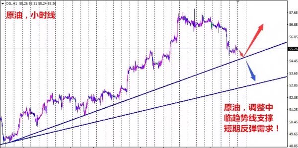 原油方面:无论现在行情怎么跌,相比之前的连续上涨来说都是小菜,都是正常的回调测试支撑,所以原油不要追空,反弹高位空比较合适,不过EIA数据行情反而小,这就是前面大跌的后遗症,价格已经跌完,或者跌到上升趋势线支撑了,那么再跌也就跌不动了,所以我们做了个短线多单获利止盈离场。短期行情会反复,至于会不会在55一带支撑然后继续上涨,得看后续的行情发展,昨天EIA既然都没有大跌,小时线反而小幅回升,那么短期就还有反弹过程,目前这种反弹是否会演变为继续上涨,但反弹幅度倒是可以期待,操作上先以昨天低点一带,或者上升趋势线支撑看涨,反弹力度大的话可能会上升到56一带;日内操作低多为主。