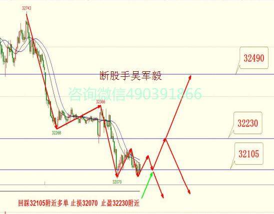 军毅礼拜一观点: 1.回踩32105附近多单止损32070止盈32230附近 2.回踩32000附近多单止损31970止盈32150附近